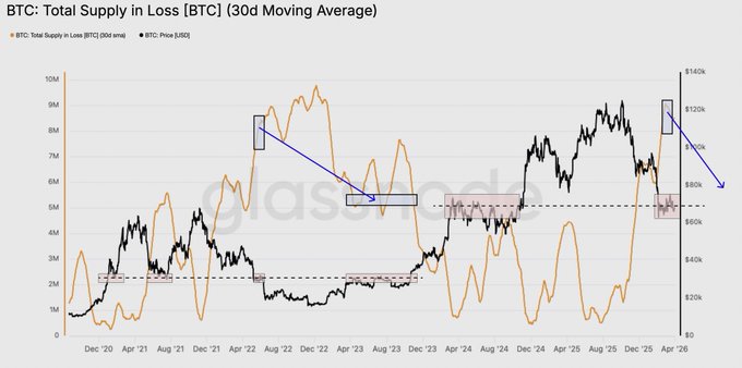 현재 비트코인 유통량의 44%가 손실을 보고 보유되고 있습니다.
