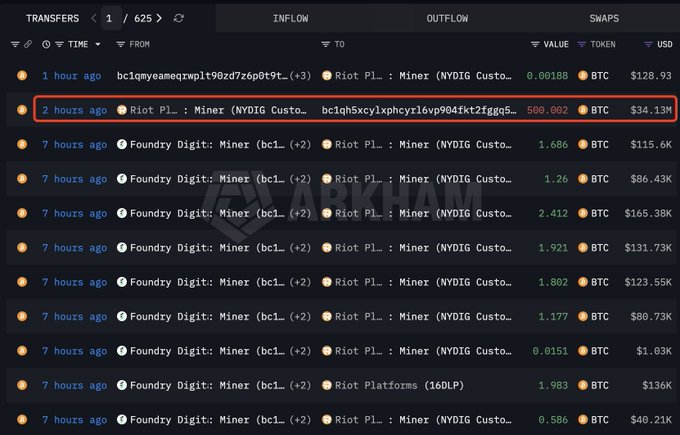 새 소식: 라이엇 플랫폼이 500 비트코인(BTC) (약 3413만 달러)를 알 수 없는 지갑으로 이체했습니다.
