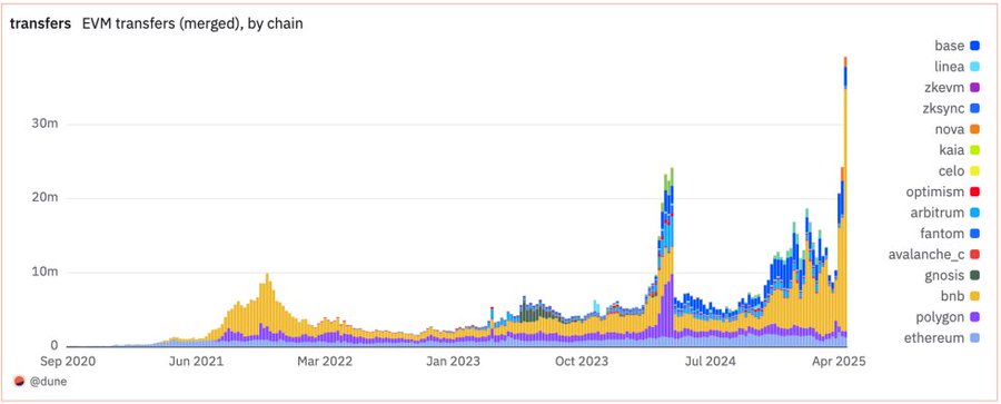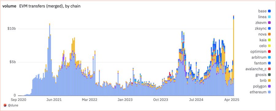 4월, 이더리움(ETH) 온체인 스테이블코인 거래량 9,080억 달러로 사상 최고치 기록 테크인아시아에 따르면, 이더리움(ETH)의 온체인 스테이블코인 거래량이 2025년 4월에 9,080억 달러로 사상 최고치를 기록하며, 스테이블코인의 점점 더 확대되는 채택을 보여주고 있습니다.