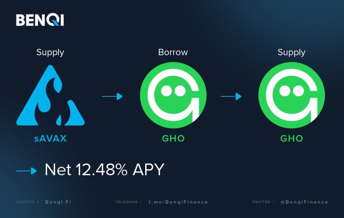 $sAVAX을 스테이블코인 수익 농장으로 바꾸는 루프. $ 아발란체(AVAX) 예치(stake) 5%의 보상을 계속 받으세요. 매도하지 않고 4.28%의 GHO를 빌리세요. 아베(AAVE) 에서 12.48%로 다시 공급하세요.