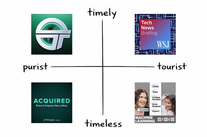 미디어를 꽤 흥미롭게 분류해 봤는데, 크게 두 가지 주요 청중으로 나뉘네요. • 순수주의자: 특정 주제에 몰두하는 사람 • 관광객: 조금 더 폭넓은 관심사를 가진 사람 소셜 미디어 앱, 예를 들어 Spotify 같은 플랫폼에 순수주의자들을 한데 모아 토론할 수 있는 기능을 만드는 게 좋을지 생각해 봤어요. twitter.com/jinglingcookies/st...