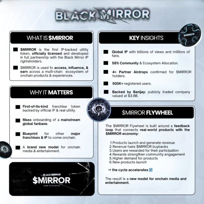 블랙 미러 체험 & $MIRROR 토큰 ⚫🪞 블랙 미러는 오랫동안 기술, 정체성, 통제에 대한 우리 인간의 불안정한 관계를 탐구해 왔습니다. 각 에피소드는 우리의 가능한 미래와 개인의 행동이 가져올 수 있는 잠재적 결과를 왜곡된 거울처럼 비추며, 블랙 미러는 대중문화에서 독특한 위치를 차지하고 있습니다. 새로운 블랙 미러 체험을 통해 성찰은 참여형 경험이 됩니다. @KorProtocol 인프라를 기반으로 구축된 @blackmirror_xp는 KOR의 IP 등록, 라이선싱 및 메타데이터 표준을 사용하여 IP를 온체인으로 가져옵니다. $MIRROR는 단순한 팬 토큰을 넘어 보유자가 적극적인 참여자가 될 수 있도록 해줍니다. 9월 8 에어드랍 당시 40만 건 이상의 등록을 기록한 이 토큰은 몰입형 온체인 세계로 진입하는 핵심 관문 역할을 합니다.