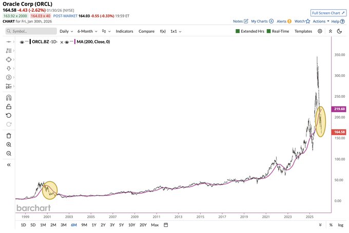 속보 🚨: 오라클 $ORCL는 현재 200일 이동평균선보다 25% 낮은 가격에 거래되고 있으며, 이는 폴카닷(DOT) 버블 붕괴 이후 가장 큰 폭의 하락입니다 📉📉