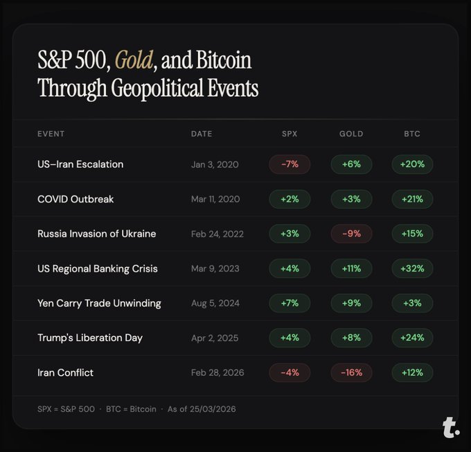 7번의 위기, 7번의 승리 $BTC 팬데믹 공포부터 은행 붕괴, 전쟁까지, 비트코인은 불확실성이 최고조에 달할 때마다 금과 주식을 능가하는 성과를 보여왔습니다. 🫣 최근 분쟁이 시작된 지 23일째입니다. 이 기록이 계속될까요? 🤔