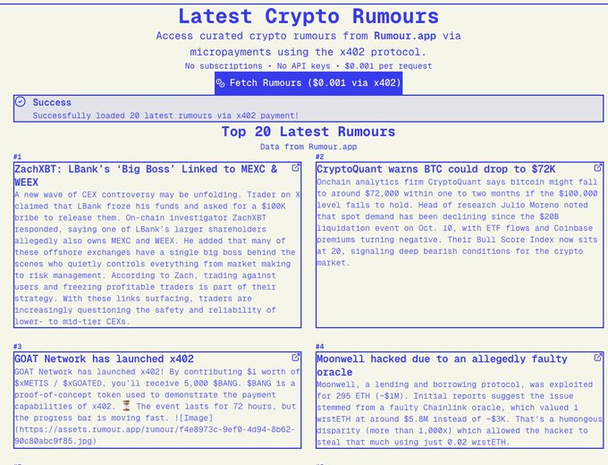x402 프로토콜을 통해 0.0001달러를 지불하여 최신 암호화폐 뉴스를 받았습니다.