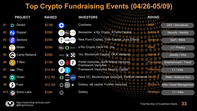 🔥최근 2주간 (4월 26일 - 5월 9일) 상위 10대 암호화폐 자금 조달 이벤트 지난 2주 동안 33건의 자금 조달 라운드가 있었습니다. 암호화폐 시가총액이 증가함에 따라 1차 시장 분위기가 개선되고 있습니다. 1. 데리빗(Deribit), @coinbase에 인수됨 2. @DoppelHQ,