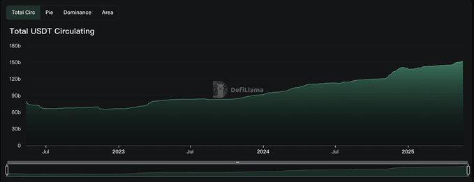 #오늘의 차트 디파이라마(defillama)의 최신 데이터에 따르면, 테더(Tether)가 발행한 스테이블코인 테더 USDT(USDT)의 총 공급량이 1,500억 달러를 넘어서 약 1,520억 달러의 새로운 역대 최고치를 기록했습니다. 2025년 이후 발행 거래량이 꾸준히 증가하고 있습니다. With