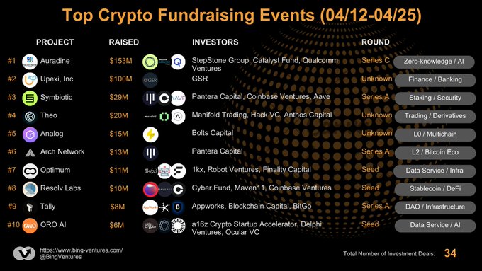 🔥최근 2주간(4월 12일 - 4월 25일) 상위 10대 암호화폐 자금 조달 이벤트 지난 2주 동안 34건의 자금 조달 라운드가 있었으며, 이전 기간보다 적었습니다. 1. <@Auradine_Inc>, <@stepstonegroup>, <@SamsungCatalyst>, <@QualcommVenture>의 투자를 받음 2. 업엑시(Upexi), 주식회사,