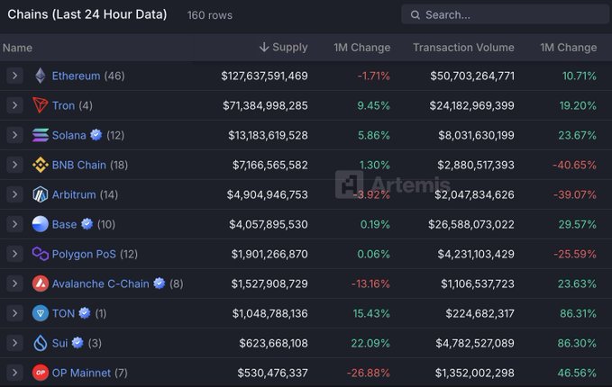 #오늘의 차트 안정화폐의 공개 블록체인 상 유입 및 유출 데이터와 총 공급량 변화는 온체인 생태계의 회복을 보여주는 중요한 지표입니다. 다양한 공개 블록체인 중에서 이더리움(ETH)은 1,270억 달러의 안정화폐로 최상위를 차지하고 있습니다.