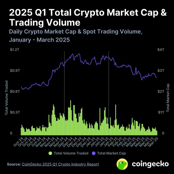 #오늘의차트 @coingecko에서 발표한 2025년 1분기 암호화폐 산업 보고서에 따르면, 암호화폐 시장은 도널드 트럼프의 취임 이틀 전인 1월 18일에 3.8조 달러의 지역 최고점에 도달했습니다. 그 직후, 시장은 하락세로 전환되었습니다.