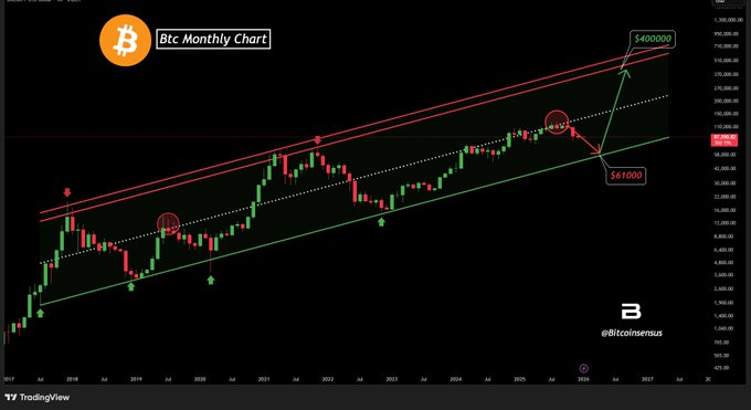 $BTC 매크로 채널 여전히 건재 🚀 📊 비트코인은 2017년부터 수년간 지속된 상승 채널 내에 머물러 있습니다. 역사적으로 중간선 재시험 시마다 상단 저항선까지 대규모 상승이 나타났습니다. 잠재적 돌파 목표: $400,000 핵심 지지선: $61,000 #비트코인 #암호화폐