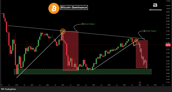 비트코인 도미넌스 약화 = 알트코인 시즌? 🔥 📉 $BTC 현재 지배력이 다년간의 추세선에서 거부되고 있습니다. 2021년의 비슷한 거절은 대규모 알트코인 열풍을 촉발했습니다. 새로운 하락세가 나타나면 지배력이 40% 영역으로 향할 수 있습니다. #알트코인 #비트코인지배력
