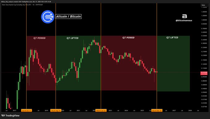 알트코인 시즌 신호일까요? — QT 가격이 방금 올랐습니다 🚨 📊QT가 종료될 때마다 알트코인/ 비트코인(BTC) 비율이 급등했습니다. 🟢 QT 해제 (2025년 12월) — 2020년 및 2019년과 동일한 설정 유동성 변화가 알트코인의 상승세를 부추길 수 있다 (NFA) #알트코인 #암호화폐