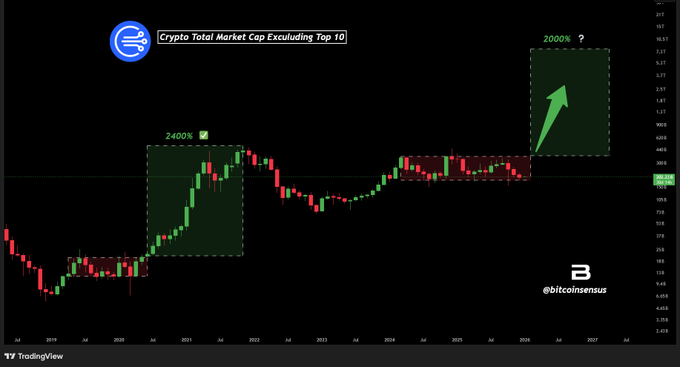 알트코인 마이크로캡들이 상승세를 타려나? 📈 상위 10개 코인을 제외한 전체 암호화폐 시가총액이 2020년 구조를 반영하고 있다 📊 마지막 돌파 = DeFi 및 알트코인 붐 기간 동안 2400% 상승 현재 횡보세 = 수개월간의 횡보 🚀 또 다른 2000% 상승 가능성? 타이밍이 가까워 보인다 #알트코인 #암호화폐