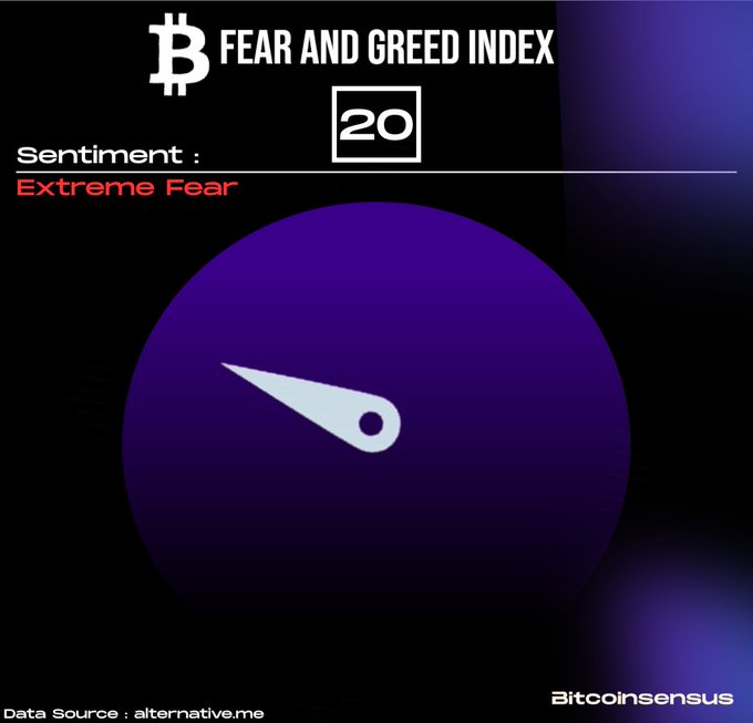 공포가 극에 달했습니다: $BTC 극심한 공포 심리 📉 공포 & 탐욕 지수 20 = 극심한 공포 📊 최대 고통 = 최대 기회? 이제 시야를 넓혀 장기적인 관점에서 생각할 때입니다 #비트코인 #암호화폐