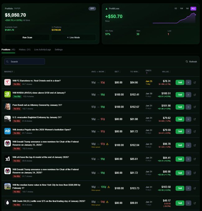 다음 주는 모의 투자 봇의 성능을 확인하는 데 있어 흥미로운 한 주가 될 것입니다. 만약 100% 승률(30승 0패 - 이미지의 1패는 테스트 목적이었습니다)을 유지한다면, 실제 자금으로 거래할 수 있는 폴리마켓 실제 투자 봇을 출시할 예정입니다. 추가할 내용은 다음과 같습니다. - 손절매 - 이익 실현 - 광범위한 시장을 더욱 명확하게 만들고 최소 거래량 설정합니다. - 자동 청구 기능으로 백그라운드에서 실행되는 동안 손쉽게 거래할 수 있습니다.