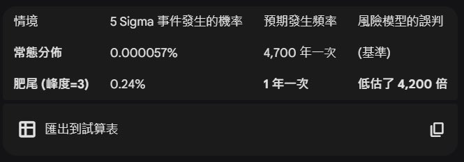 전략 설계에서 초과 첨도는 선택 사항이 아닌 필수 지표입니다. 초과 첨도가 0일 때, 5시그마라는 극단적인 경우는 4700년에 한 번 발생합니다. 하지만 초과 첨도가 3일 때는 1년에 한 번 발생합니다. 초과 첨도는 정규 분포 모델을 보완하는 요소입니다.