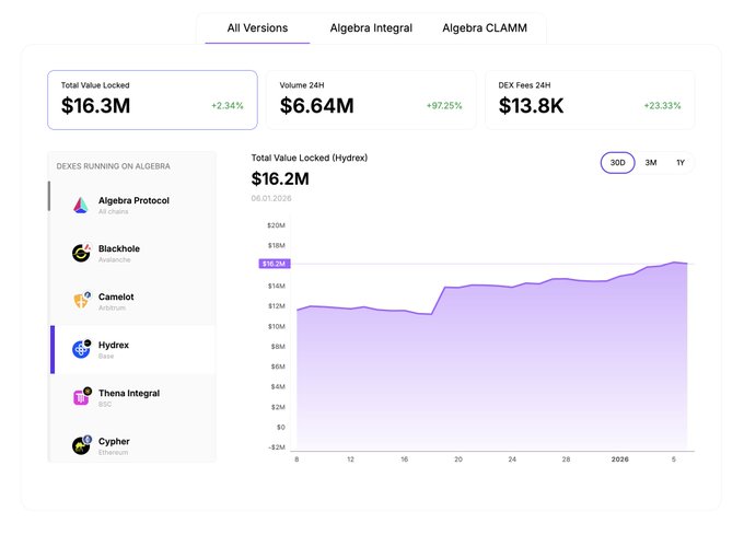 🧢 @HydrexFi는 모든 주요 지표에서 2026년을 긍정적으로 시작합니다 📈 +2.3% Total Value Locked(TVL) +97% 24시간 거래량 거래 수수료 23% 추가 @base에서 최고의 유동성 허브를 찾으셨나요? Algebra Integral이 모든 것을 지원합니다 ⚙️