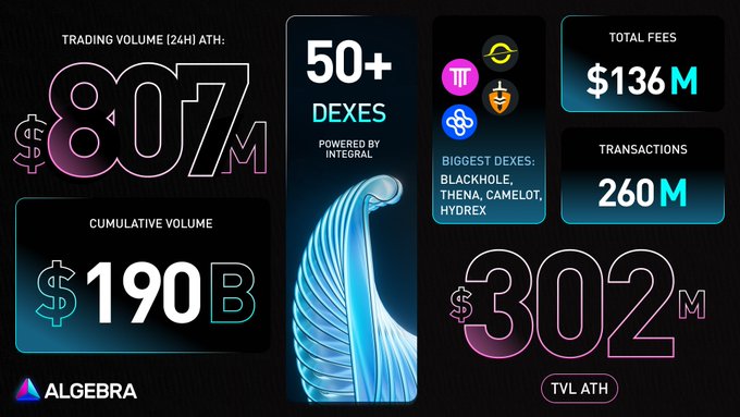 💅 여자 수학, 하지만 디파이(DeFi) 방식으로: 뛰어난 자본 효율성 + 다양한 멋진 CLAMM DEX = 대수학 생태계 지난 7일은 순조롭게 지나갔어요 👇 • 평균 Total Value Locked(TVL) 1억 8,500만 달러 • 거래량 8억 1,340만 달러 • 57만 8천 달러 수수료 이것이 바로 1세대 V4 탈중앙화 거래소(DEX) 인프라의 모습입니다 👀 추가 통계: http:/algebra.finance