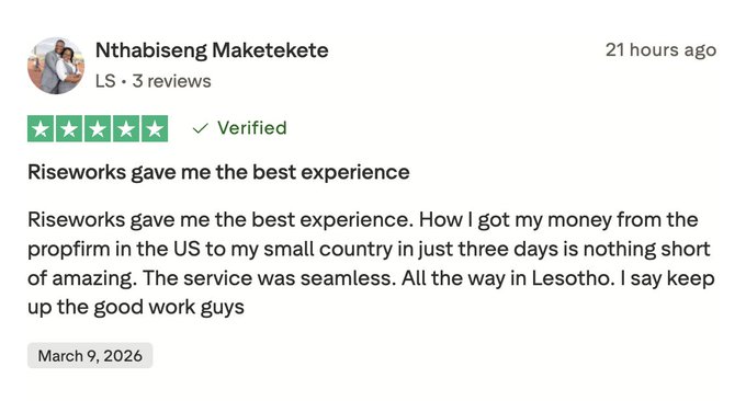 작은 나라에서도 Rise는 사용자에게 원활한 급여 지급을 제공합니다. 이번 주에는 남아프리카 레소토의 만족스러운 계약자분께서 남겨주신 후기를 공유하게 되어 기쁩니다. 더 많은 후기를 보시려면 TrustPilot 페이지(trustpilot.com/review/www.rise...…)를 방문하세요.