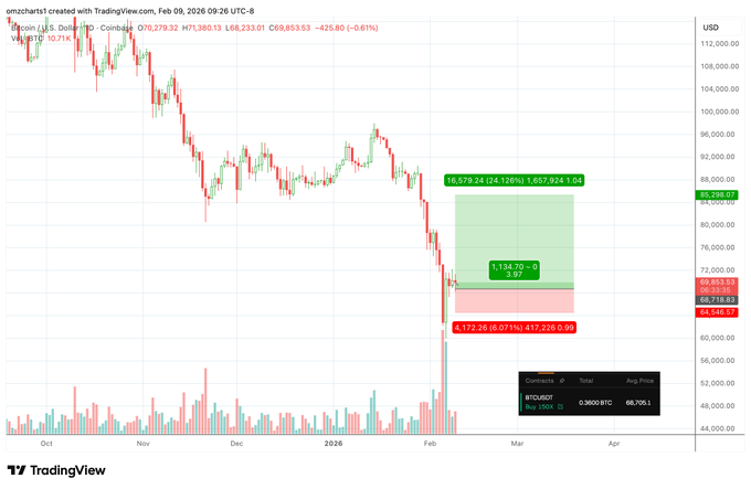 스윙은 비트코인(BTC) 68,700달러에 매수했습니다. 뉴욕 증시 이후로 롱 포지션을 꾸준히 늘려왔습니다. 월말 마감 전에 8만 달러 이상으로 상승할 거라고 예상합니다. 위험 부담액: 1,500달러 | 보상액: 5,000달러 이상
