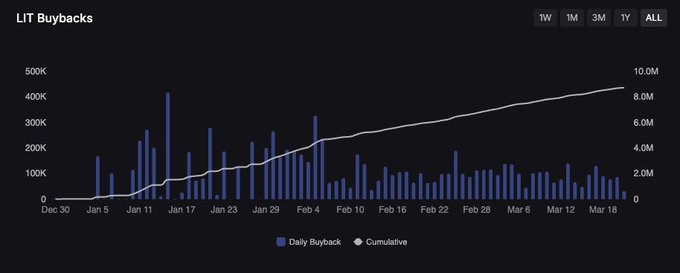 이제 통계 페이지에서 LIT 자사주 매입 내역을 확인할 수 있습니다. 자사주 매입은 시장 상황과 관계없이 지속적으로 프로그램 방식으로 수행됩니다.