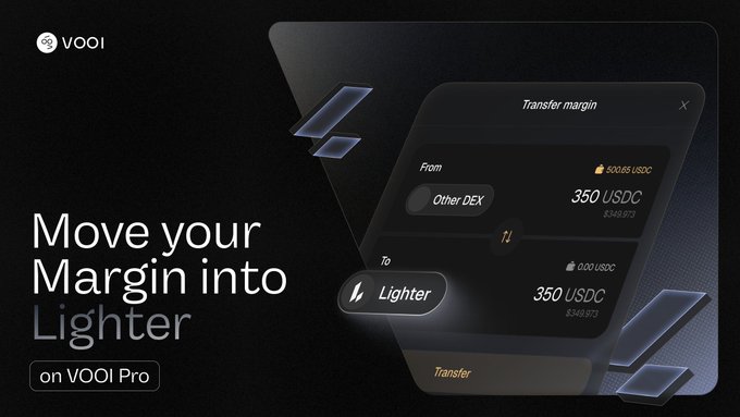 이제 탭 한 번으로 다른 DEX에서 @Lighter_xyz 계정으로 마진을 바로 이체할 수 있습니다. 클릭 한 번으로 필요한 곳 어디든 Lighter 계정으로 자금을 이체하세요. VOOI 마진 이체를 통해 몇 초 만에 가능합니다. 마진을 이체하고 Lighter Perps를 거래하세요 → http:/pro.vooi.io/transfer
