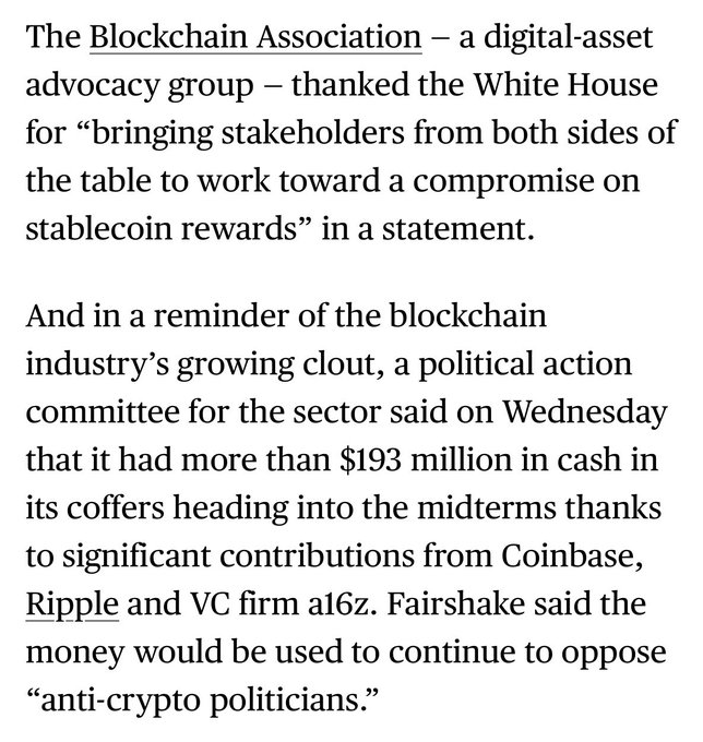 암호화폐 정치활동위원회가 "반암호화폐 정치인"에 맞서기 위해 거의 2억 달러에 달하는 자금을 확보했습니다. 암호화폐 업계는 이제 수십 년 동안 전통적인 은행 로비가 행사해 온 것과 같은 종류의 힘(자금)을 휘두르고 있습니다. 이제 같은 게임을 할 수 있습니다. 시대가 변하고 있습니다. via @olgakharif @emilymason00
