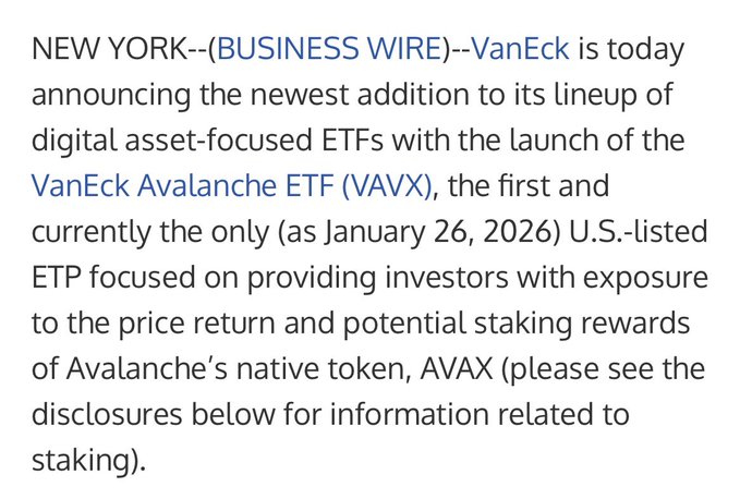 오늘 출시됩니다… 첫 번째 현물 아발란체(AVAX) ETF. 밴엑 애벌랜치 ETF(VAVX).