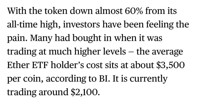 현물 이더리움(ETH) ETF 구매자들은 코인당 평균 3,500달러를 지불했습니다. 현재 가격 = 2,100달러 지난 6개월은 정말 끔찍했어요. @Melambaye를 통해