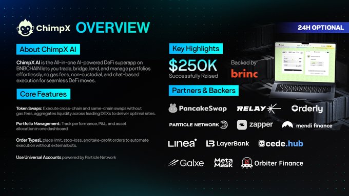 ➡️ ChimpX AI는 @BNBCHAIN에서 사용할 수 있는 올인원 AI 기반 DeFi 슈퍼앱으로, 가스 수수료 없이, 비 수탁형, 채팅 기반 실행을 통해 간편하게 거래, 브릿징, 대출 및 포트폴리오 관리를 할 수 있어 원활한 DeFi 거래를 지원합니다.