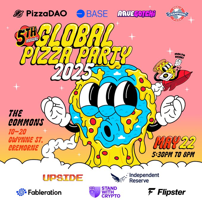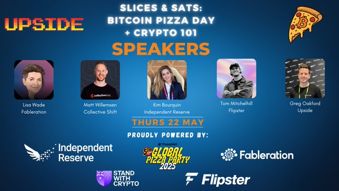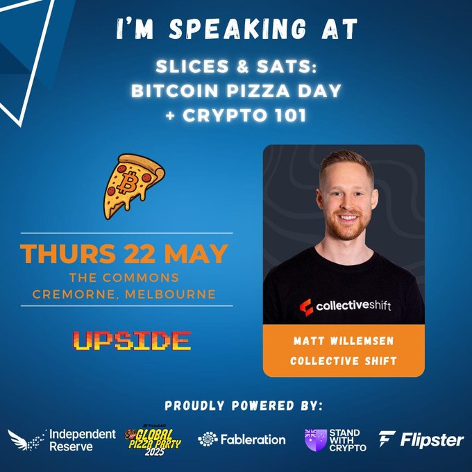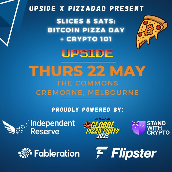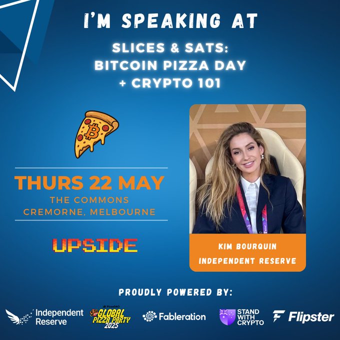 멜버른에서 이번 목요일에 열리는 @0xUpside x @indepreserve x @Pizza_DAO #비트코인 피자 데이 이벤트의 연사로 참여하게 되어 기쁩니다! 여기에서 등록하여 자리를 확보하세요: lu.ma/qmqhsuhk?tk=pwbwCC…