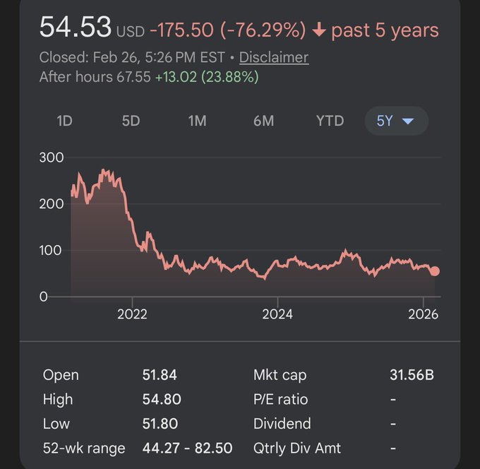 누군가 이 차트에서 @blocks $XYZ가 해고 발표 이전에 천재적인 경영으로 엄청난 수익을 올리던 시장 선도 기업이었으며, 기술주가 두 배로 오른 5년 동안 거의 80%나 하락하지 않았다는 것을 보여줄 수 있을까요?