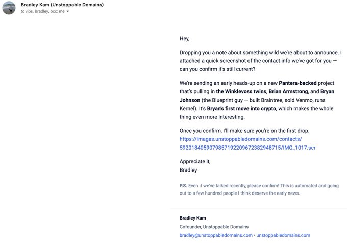 🚨 이 공간에 꽤 오래 있었는데, 오늘 해킹당할 뻔했어요. 조심하시고 안전하시길 바랍니다! 브래들리 캠 사칭범(전 @unstoppableweb)에게서 윙클보스 쌍둥이, 브라이언 암스트롱, 브라이언 존슨이 함께하는 "판테라가 지원하는 새로운 프로젝트"에 대한 이메일을 받았어요.