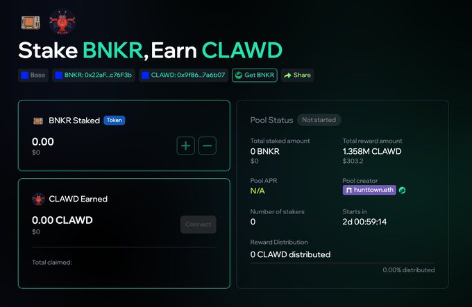 그래서 여러분 대부분은 $bnkr 예치(stake) 하고 $clawd를 벌고 싶어 하십니다. 매우 기본적이다. 다른 토큰으로 예치(stake) 하고 수익을 얻고 싶으시면 채팅창에 남겨주세요. 투표는 1월 30일까지 진행됩니다. twitter.com/MintClubPro/status...