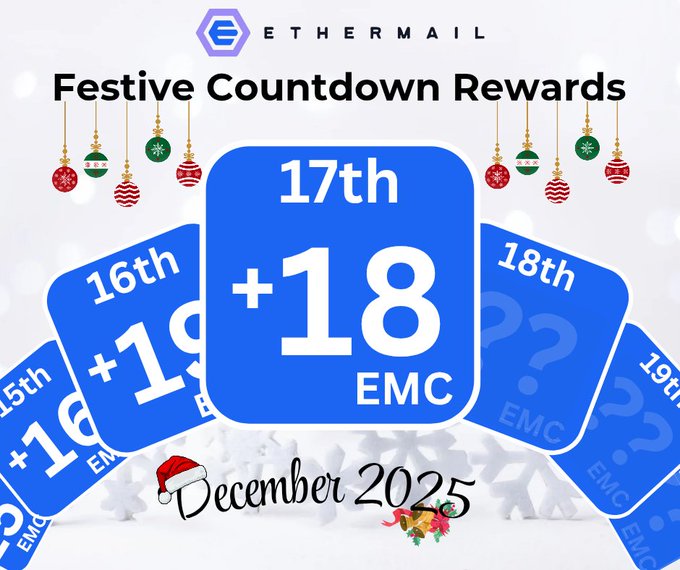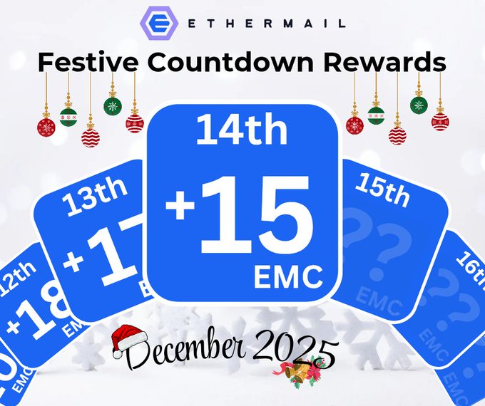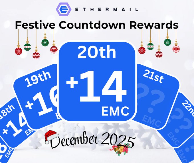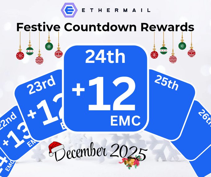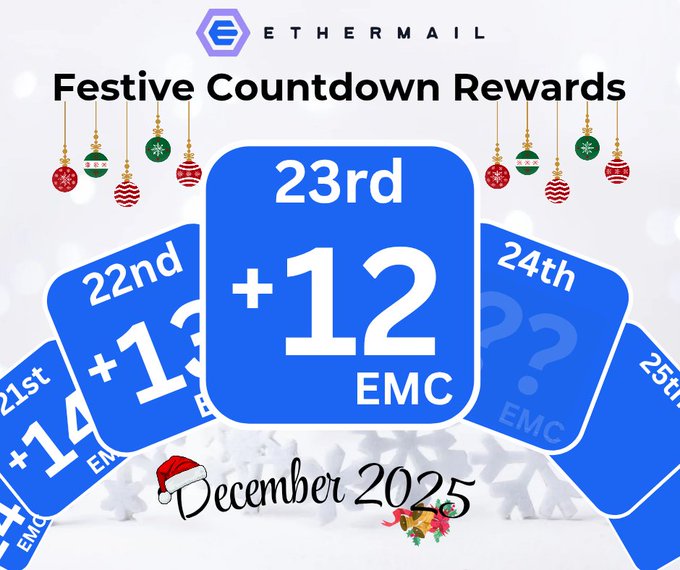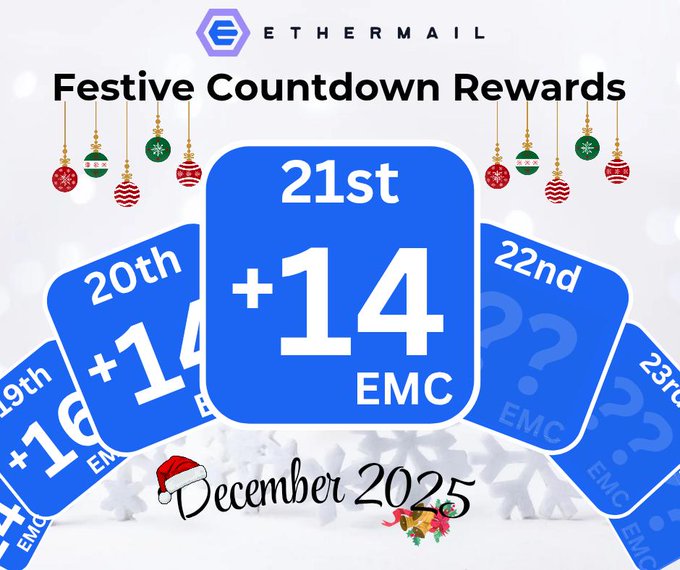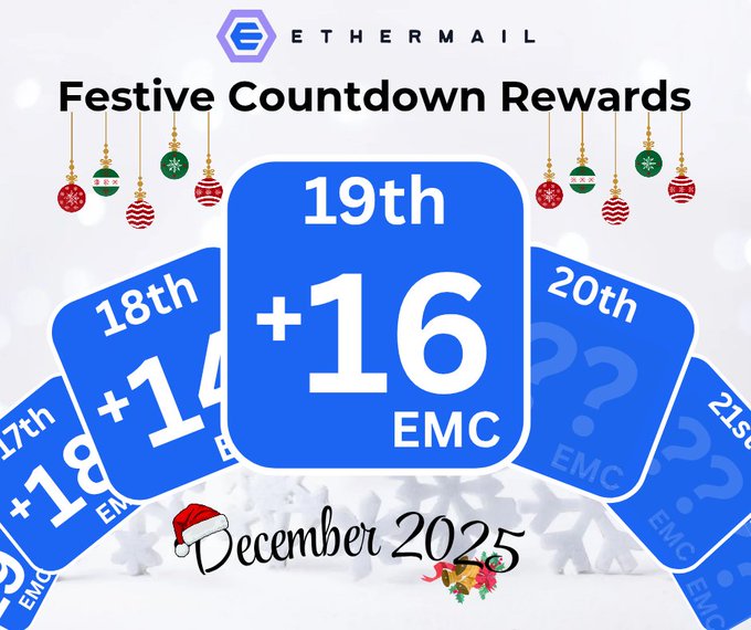 19일차. ⏳ 5일 남았습니다… 지금까지 EMC를 얼마나 모으셨나요? 👀 EtherMail 앱을 열고 로그인해서 오늘 드롭도 받아가세요! 더 원하세요? 텔레그램 미니 앱을 통해 친구 추천 시 친구 한 명당 100 EMC를 추가로 획득하세요 ✨ t.me/ethermailappbot/app… #Ethermail_Festive_Rewards_25