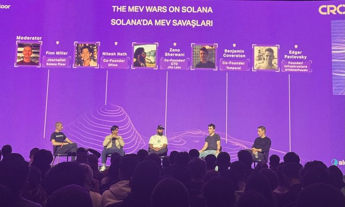 🚨신규: 크로스로드 2025 메인 스테이지의 첫 번째 패널이 진행 중이며, 솔라나(Solana)에서 가장 뜨거운 이슈 중 하나인 "솔라나(Solana)의 MEV 전쟁"을 다루고 있습니다. 연사들로는 니테시 나스(@DFlowProtocol의 공동 창립자), 자노 셰르와니(@jito_sol의 공동 창립자), 벤자민 커버스턴(공동 창립자)이 포함됩니다.