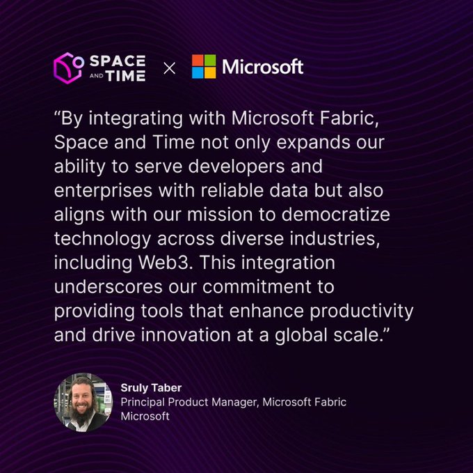📣 Just announced at #MSBuild: Space and Time indexed blockchain data will be integrated with @Microsoft Fabric. As part of the integration, Microsoft developers will be able to access Space and Time indexed data from Bitcoin, @SuiNetwork, and @ethereum through Fabric.
