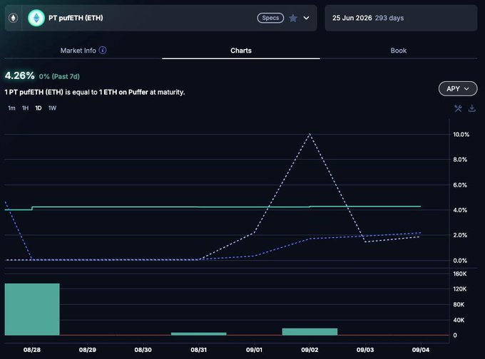 pufETH + @pendle_fi = 수익률 잠금 해제 🔓 새로운 수익 창출 방식을 통해 3.2% 기준 APR을 넘어서세요. 🔹 YT (수익 토큰): 만기일까지 Puffer에서 변동 수익률 + 1 이더리움(ETH) 포인트를 확보하세요. 수익률 상승 시 더 높은 상승 가능성. 🔹 PT(주요 토큰): ~4.26% 고정
