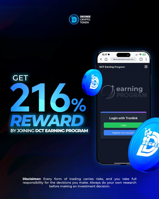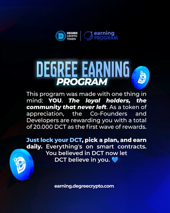 그냥 http:/earning.degreecrypto.com을 방문하세요 그리고 지갑을 연결하고, 보상 계획을 선택하고, dct를 잠그세요... 보상을 즐기세요💎💙 #디그리크립토토큰 #dct #dct보상프로그램