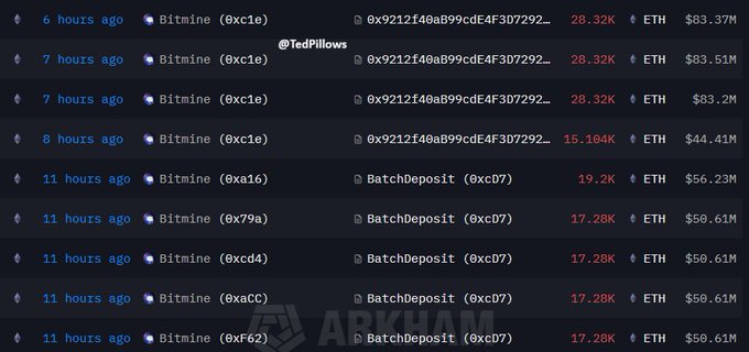 BitMine은 오늘 $ETH에 7억 8천만 달러를 추가로 스테이킹했습니다. 단 이틀 만에 BitMine은 이더리움에 총 10억 달러를 스테이킹했습니다.