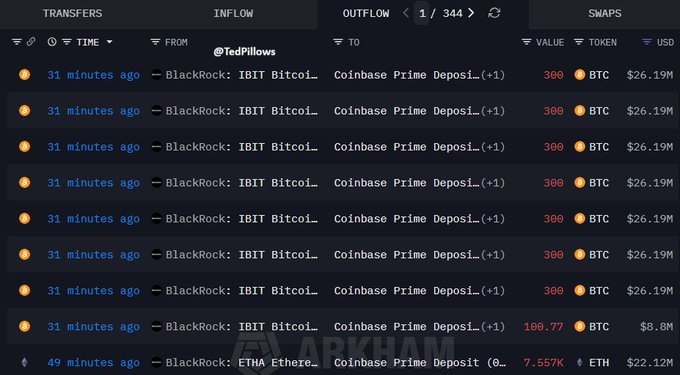 블랙록은 오늘 코인베이스에 1억 9200만 달러 상당의 $BTC 코인과 2200만 달러 상당의 $ETH 코인을 입금했습니다. 매도세가 지속되고 있습니다.