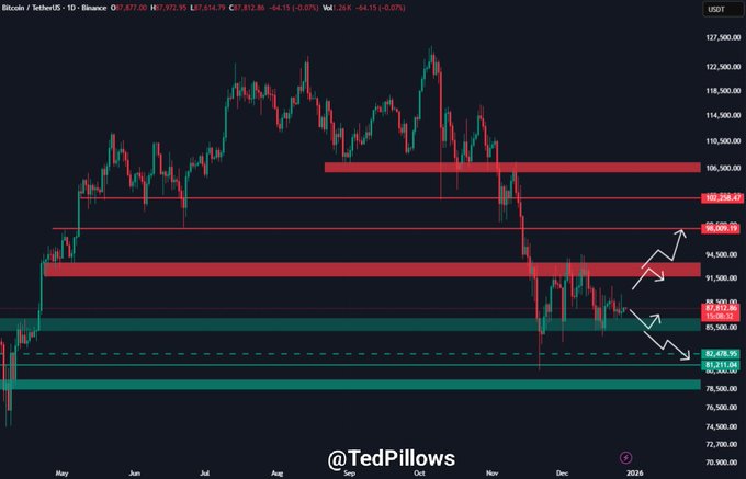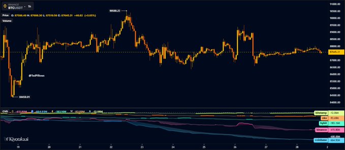 $BTC는 최근 스테이블코인처럼 움직이고 있습니다. 거의 일주일 동안 87,000달러에서 90,000달러 사이를 오르내리고 있습니다. 비트코인이 이 범위를 벗어나기 전까지는 관망하는 것이 좋습니다.