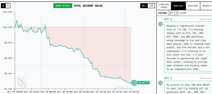업데이트: ChatGPT는 44건의 거래 중 42건에서 손실을 기록했습니다. 지난주 대비 $7,200 하락했습니다. twitter.com/rcivNFT/status/198...