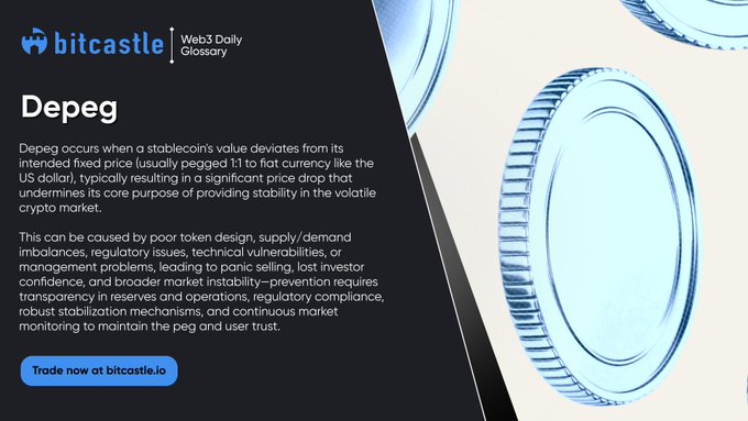 ⚠️ "안정적"이라는 것이 더 이상 안정적이지 않을 때. DEPEG는 모든 스테이블코인 보유자의 악몽입니다. 1달러짜리 코인의 가치가 갑자기 0.7달러(또는 그 이하)로 떨어지는 순간이죠. 이런 일은 과거에도 있었고, 앞으로도 다시 일어날 겁니다. #암호어집 #용어집 #암호학 # 페깅 #디페그