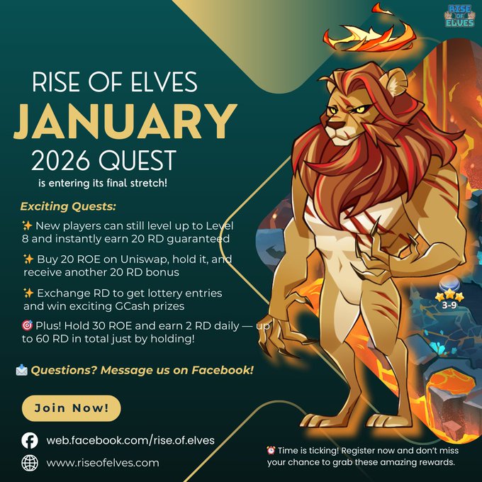 엘프의 부활 2026년 1월 퀘스트가 막바지에 접어들었습니다! 🚀 ✨ 신규 플레이어도 레벨 8까지 레벨업하고 즉시 RD 20개를 확정적으로 획득할 수 있습니다. ✨ 유니스왑(Uniswap) 에서 ROE 20개를 매수하고 보유하면 추가로 RD 20개를 보너스로 받으세요 ✨ RD를 교환하여 복권 응모권을 얻고 푸짐한 GCash 경품을 받으세요