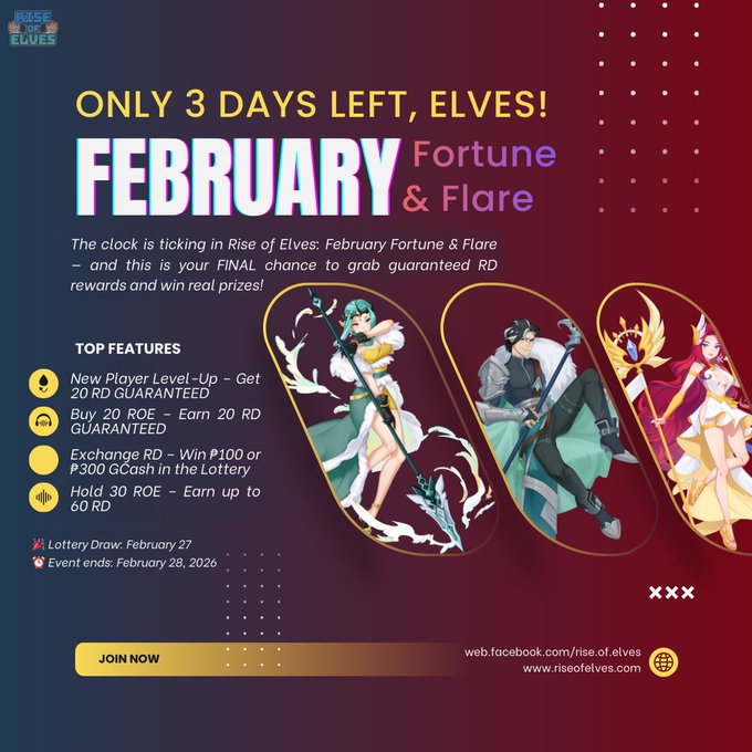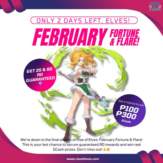 🚨✨ 엘프 여러분, 이제 단 이틀밖에 남지 않았어요! 라이즈 오브 엘프: 2월 포춘 & 플레어(Flare) 이벤트가 이제 막바지에 접어들었습니다! 확정된 RD 보상을 획득하고 실제 GCash 경품을 받을 수 있는 마지막 기회입니다. 놓치지 마세요! 🌱 신규 플레이어 레벨업 – RD 20 획득 📊 ROE 30개를 보유하면 최대 60 RD를 획득할 수 있습니다.