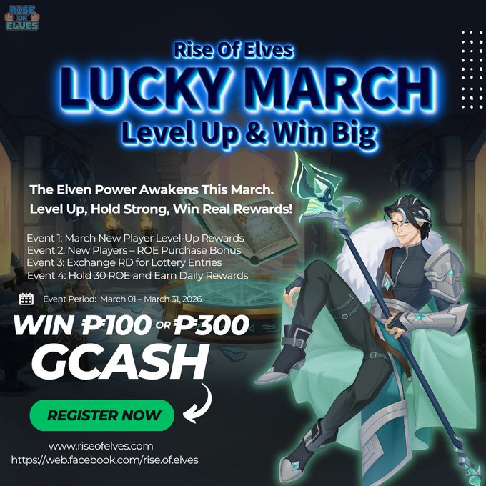 🍀✨ 행운의 3월이 돌아왔어요, 엘프 여러분! 라이즈 오브 엘프에서 엘프의 힘이 3월에 깨어납니다! 레벨업하고, 강해지고, 진짜 보상을 획득하세요! 🌟레벨 8 달성 → RD 20 확정 획득 🌟ROE 20 구매 → RD 20 확정 획득 🌟RD 교환 → 100페소 또는 300페소 GCash 획득 🌟ROE 30 보유 → 최대 RD 60 획득