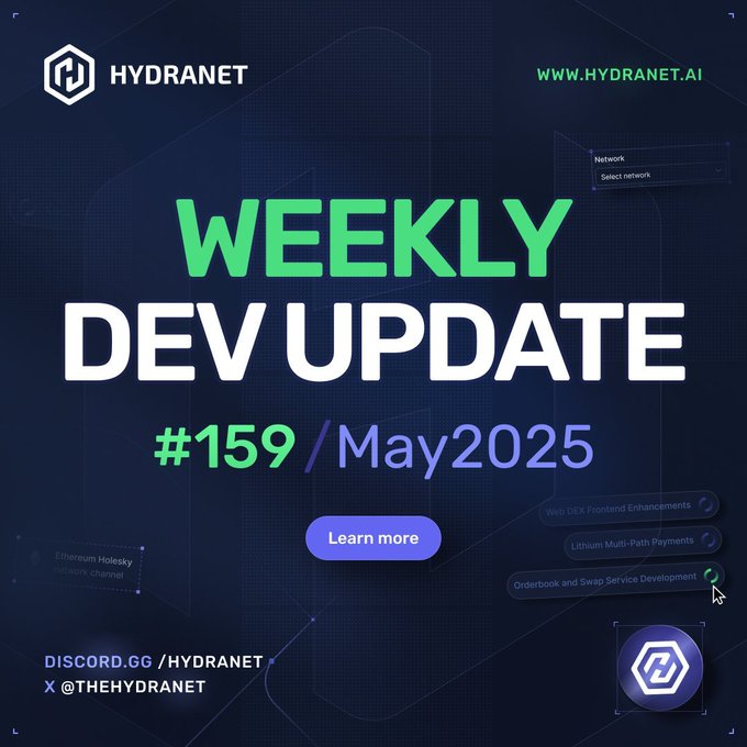 하이드라넷 - 주간 개발 업데이트 #159 하이드라넷 웹 탈중앙화 거래소(DEX) 오픈 알파 단계는 2025년 5월 13일에 출시될 예정입니다. 주목해 주세요. wallet.hydranet.ai 웹 탈중앙화 거래소(DEX): - 더 많은 버그가 해결되었고 티켓들이 처리되었습니다, - 가스 추정 문제가 해결되었습니다, - 리튬