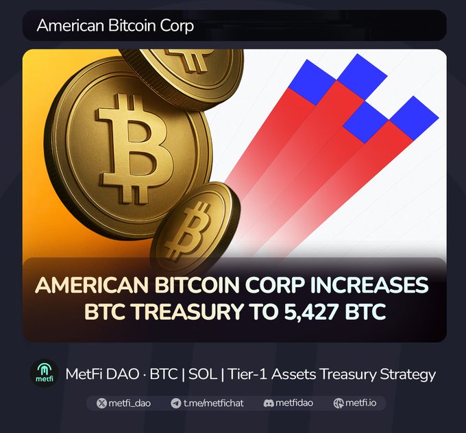 미국 트럼프 일가의 지원을 받는 아메리칸 비트코인 코퍼레이션(American Bitcoin Corp)이 329 비트코인(BTC) 추가하여 총 트레져리 5,427 비트코인(BTC) 로 늘렸습니다. 탄탄한 재무제표는 확신과 인내심으로 만들어집니다. 우리는 동일한 장기적인 원칙에 따라 자산을 축적합니다. 📈 #MetFiDAO 비트코인(BTC) #비트코인 #암호화폐 #블록체인
